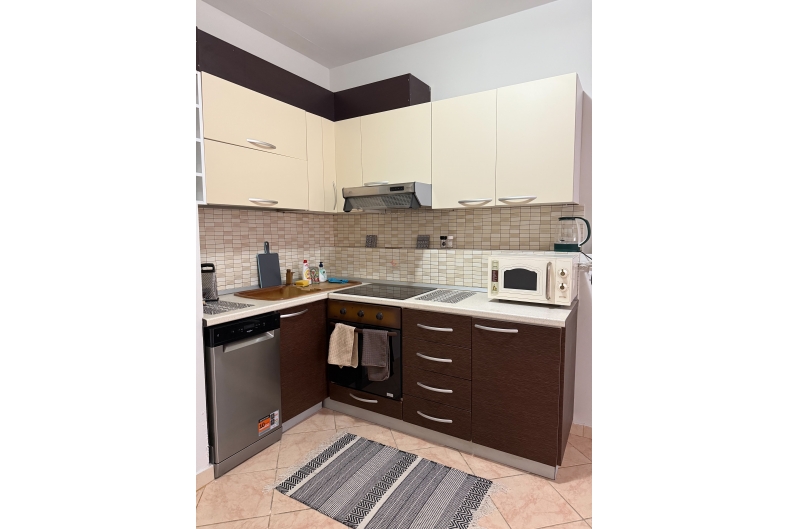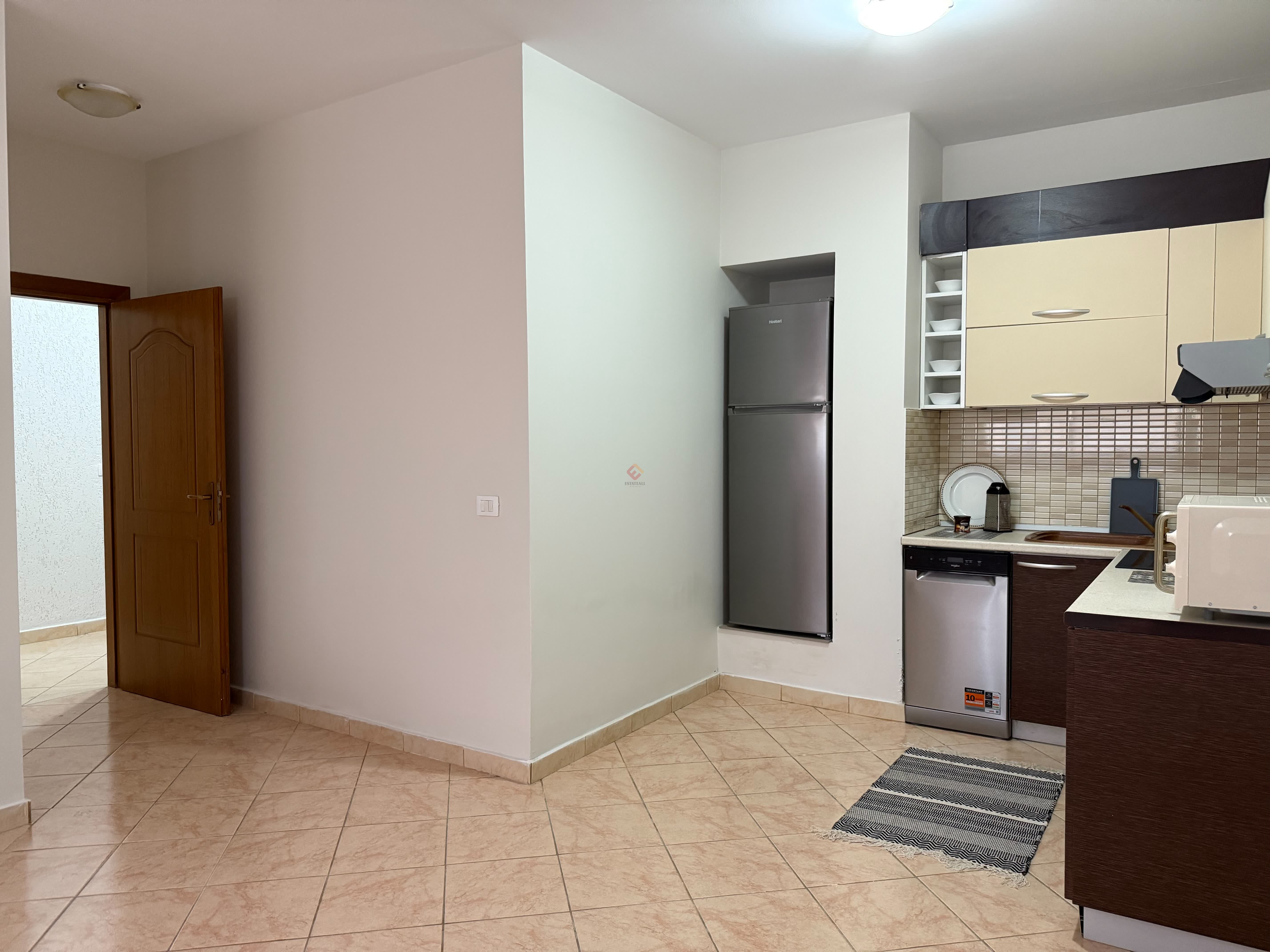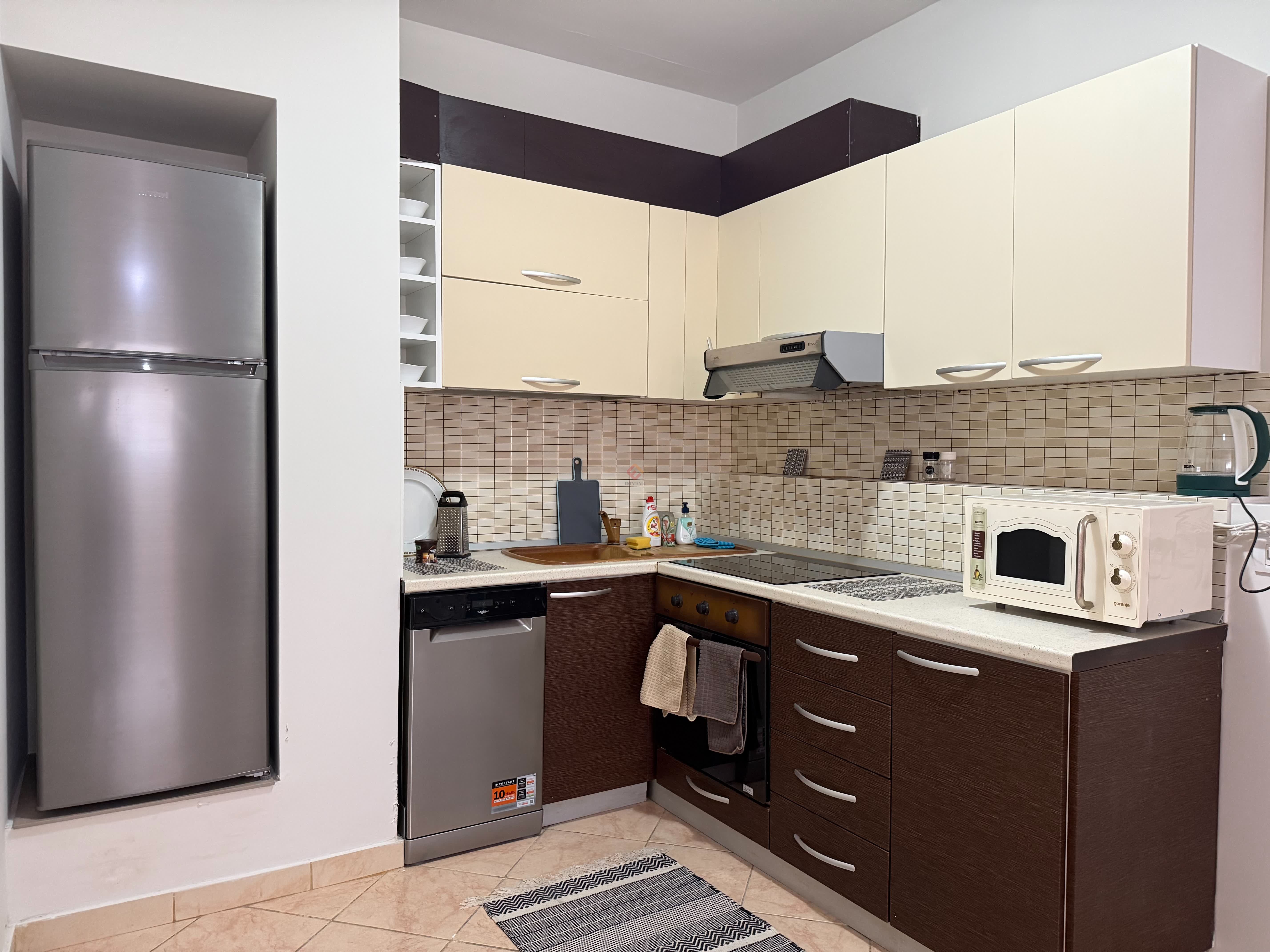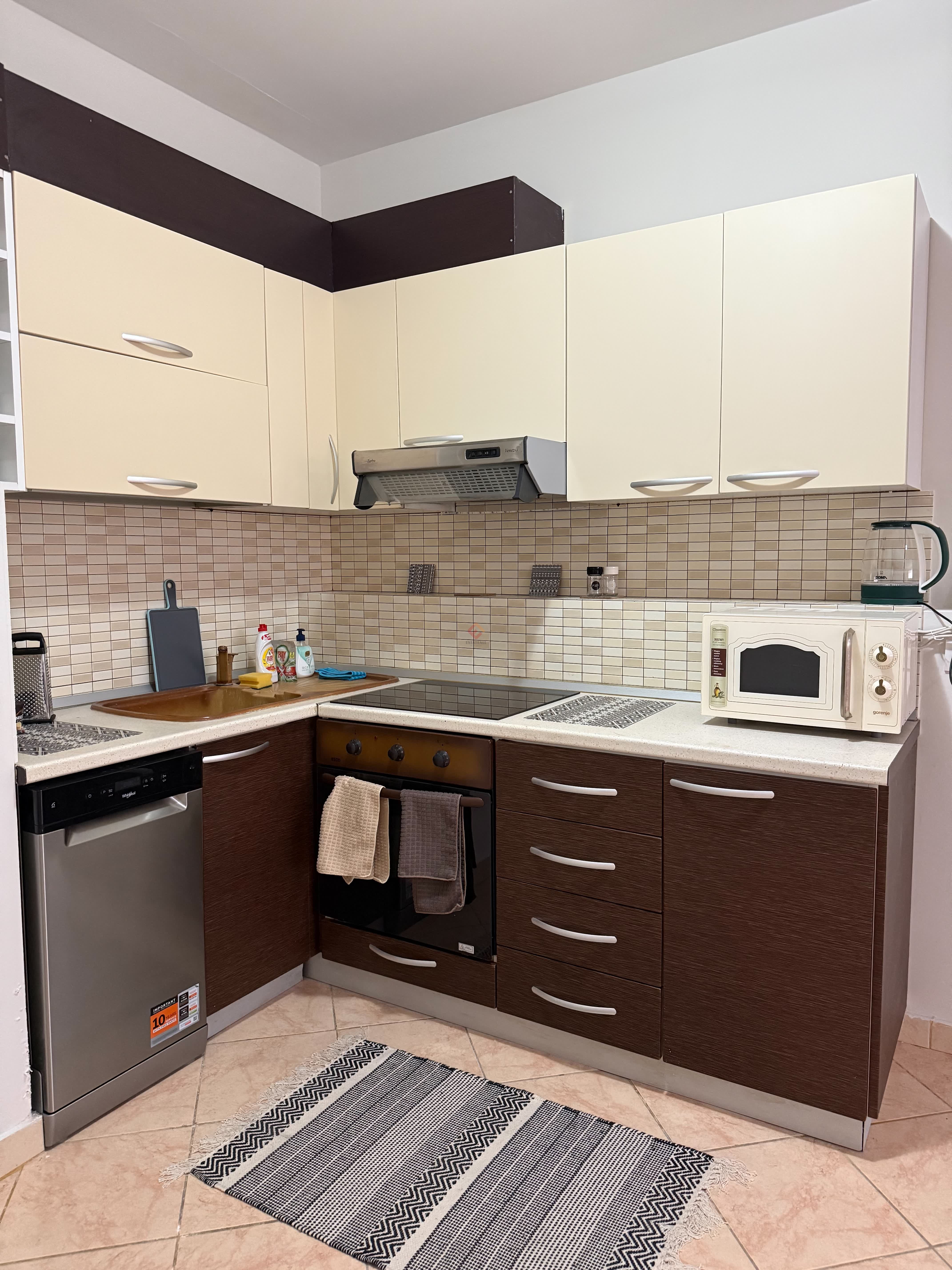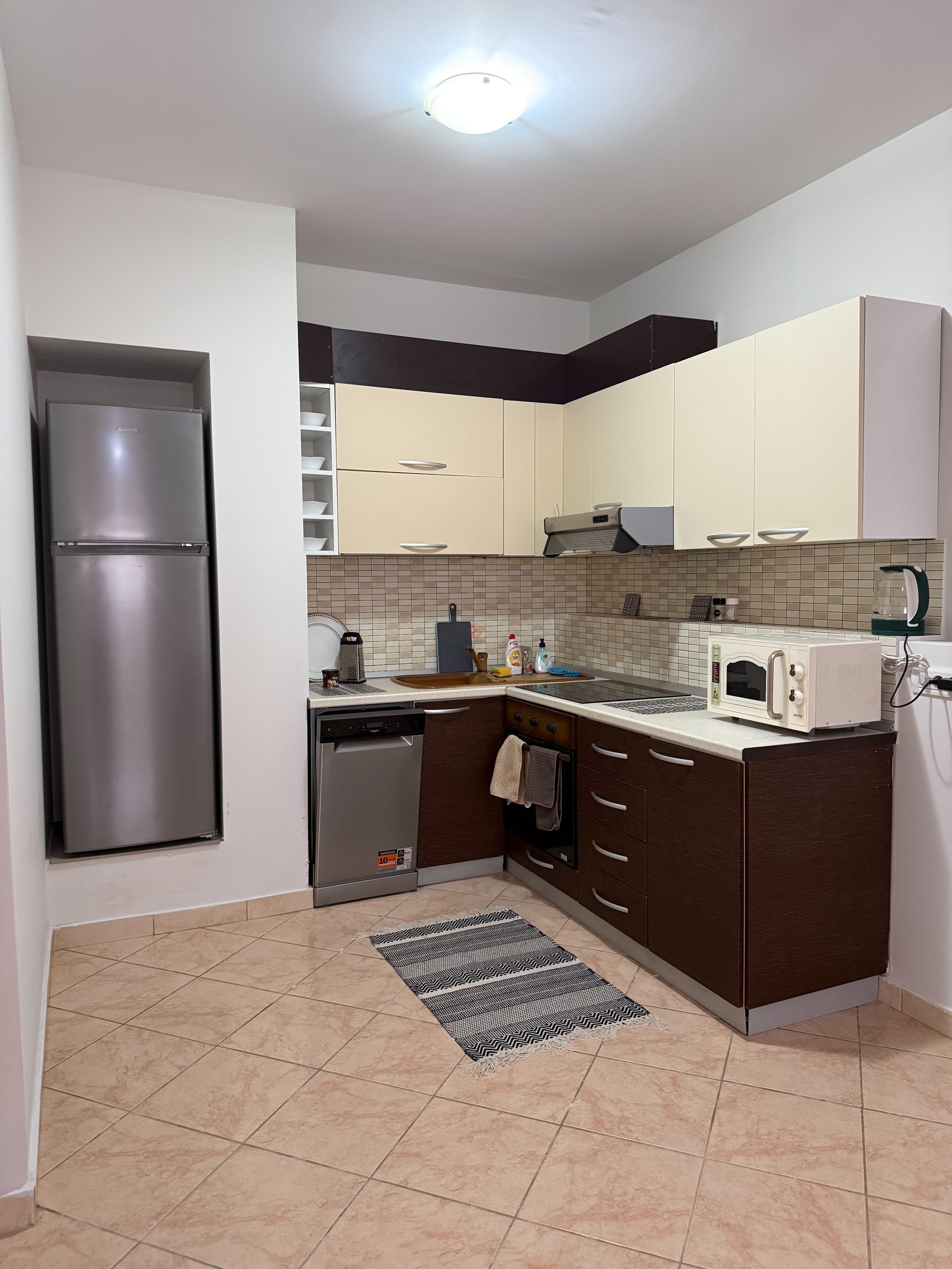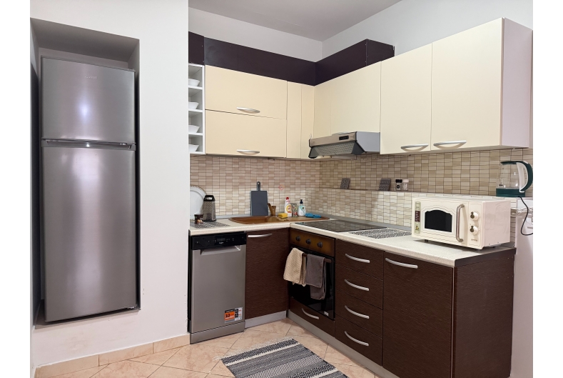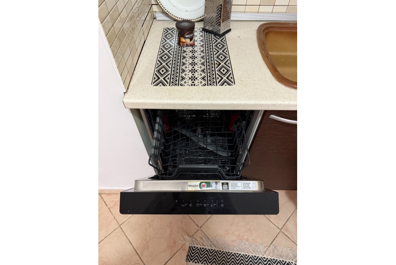 Recently renovated, it comes with appliances, including air conditioning, a dishwasher, washing machine, microwave, vacuum cleaner, and smart TV.